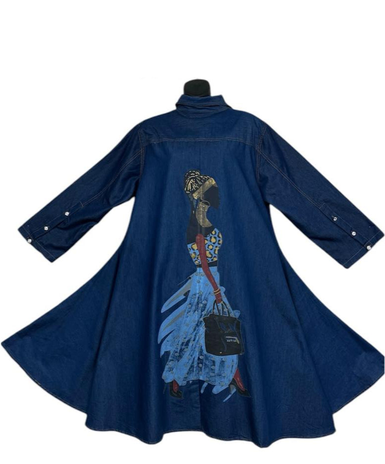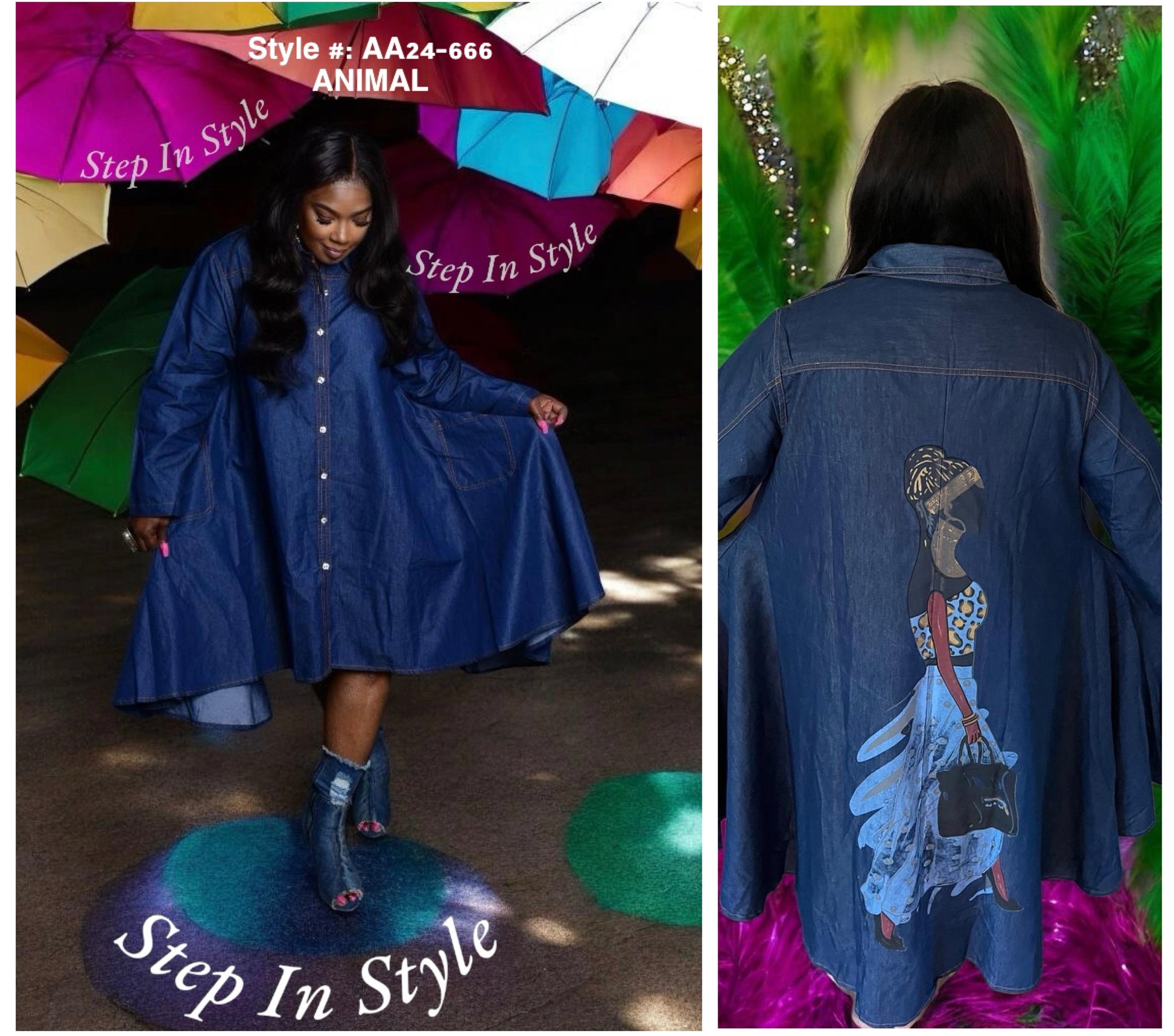 Command attention with the African Queen: Animal Print Shirt Dress: a bold fusion of classic denim and wild elegance. This shirt dress features eye-catching contrast stitching that highlights its tailored silhouette. The animal print design adds a fierce, fashion-forward edge, while the regular long sleeves make it perfect for effortless styling year-round. Button it up as a dress or wear it open as a statement layer — either way, you're royalty.